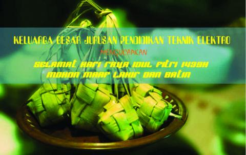 Hari Raya Idul Fitri 1439H yang jatuh pada tanggal 15 Juni 2018 terasa spesial bagi civitas akademika Jurusan Pendidikan Teknik Elektro. Dikarenakan libur hari raya (lebaran) berbarengan dengan selesainya ujian akhir semester 2017/2018. Mahasiswa dapat merasa lebih lega saat melaksanakan libur lebaran sampai tanggal 21 Juni 2018. Tidak lupa Keluarga Besar Jurusan Pendidikan Teknik Elektro Mengucapakan Selamat Hari Raya Idul Fitri 1439H.
